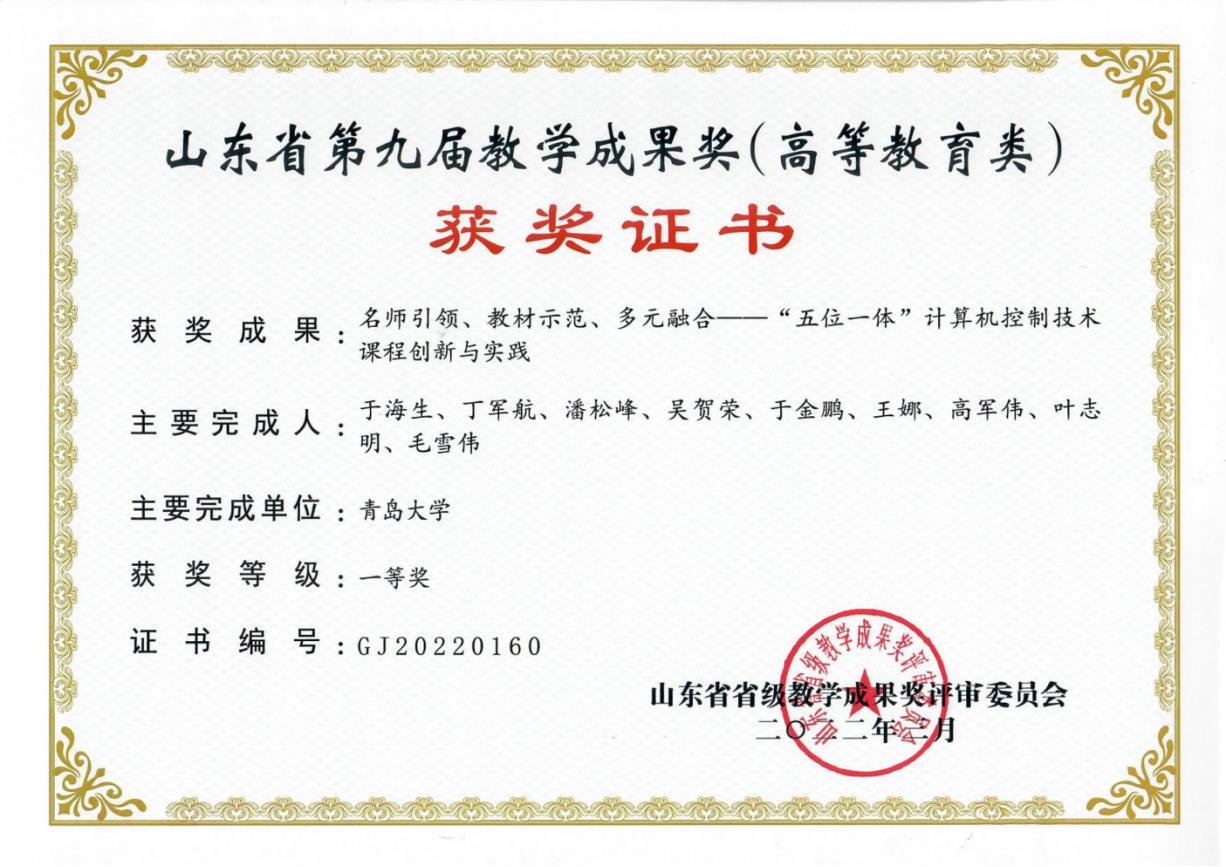 (1)于海生等,名师引领、教材示范、多元融合——“五位一体”计算机控制技术课程创新与实践,山东省第九届教学成果奖(高等教育类),一等奖,山东省教育厅,2022