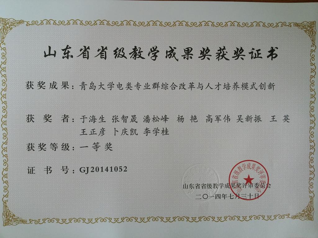 (3)于海生等,青岛大学电类专业群综合改革与人才培养模式创新,山东省第七届教学成果奖(高等教育类),一等奖,山东省教育厅,2014
