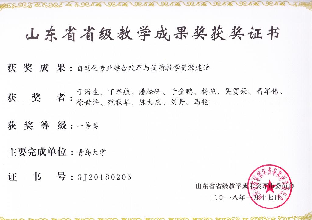 (2)于海生等,自动化专业综合改革与优质教学资源建设,山东省第八届教学成果奖(高等教育类),一等奖,山东省教育厅,2018