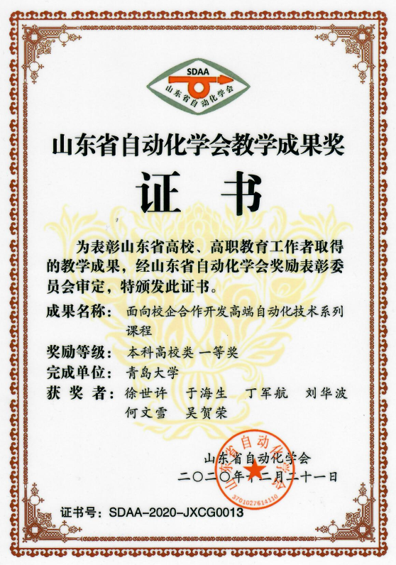 (5) 徐世许等,面向校企合作开发高端自动化技术系列课程,山东省自动化学会教学成果奖,一等奖山东省自动化学会,2020