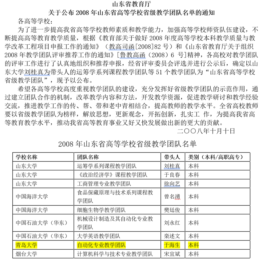 (3)于海生等,山东省省级教学团队,自动化专业,山东省教育厅,2008