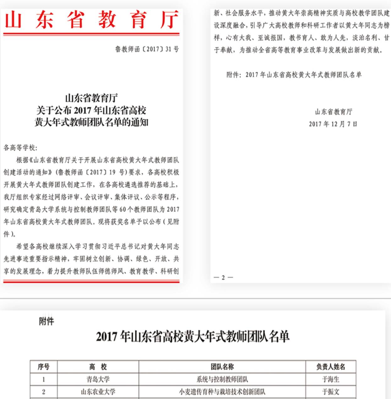 (2)于海生等,山东省高校黄大年式教师团队(系统与控制),山东省教育厅,2017